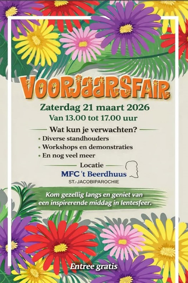 Op zaterdag 21 maart staat MFC ’t Beerdhuus in Sint Jacobiparochie (St. Jabik) in het teken van een voorjaarsfair, waar bezoekers tussen 13.00 en 17.00 uur kunnen genieten van een gevarieerd aanbod aan kramen, creativiteit, workshops en gezelligheid.